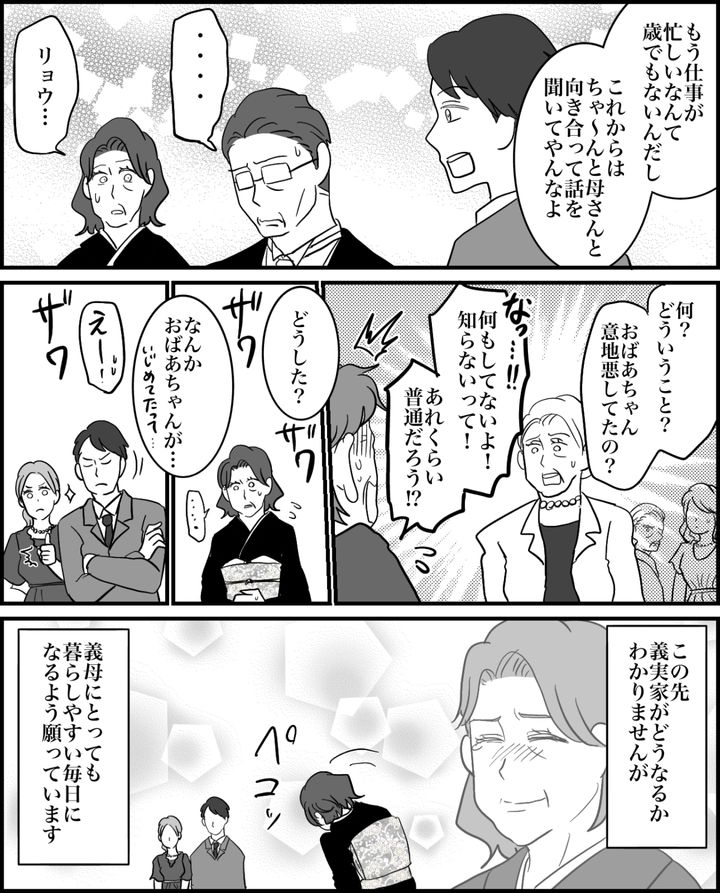 リョウが義祖母の嫁いびりを暴露すると、その場にいた親戚たちがザワつき義祖母や義父を問いただしはじめました。