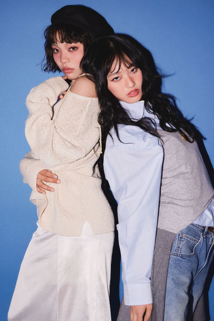 左から<TOA>カットソー¥29,700/メゾン キツネ(メゾン キツネ カスタマーセンター) 中に着たトップス¥9,900/カルバン・クライン アンダーウェア(カルバン・クライン カスタマーサービス) スカート¥4,730/チック(ループ トーキョー) パンツ¥12,100/アディダス(アディダスコールセンター) バンダナ¥2,090/原宿シカゴ 原宿店 ブーツ¥37,400/カンペール(カンペールジャパン)<HINATA>ポロシャツ¥38,500、中に着たカットソー¥27,500、シューズ(参考商品)/ともにエムエスジーエム(アオイ) ネックレス¥126,500/ジャスティン デイビス(ジャック・オブ・オール・トレーズ プレスルーム) ソックス¥5,500/スウェーディッシュ ストッキング(グレープヴァイン バイ ケースリー) スカート/スタイリスト私物 Hearst Owned