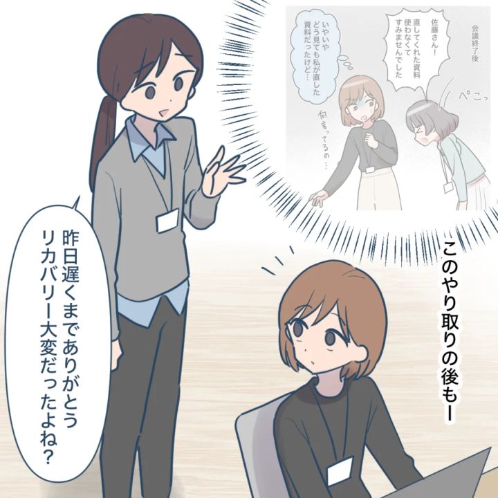 結衣さんは娘スイちゃんを迎えに行った保育園で、以前同じ職場で働いていた後輩田中さんを見かけて驚きます。数年前、新入社員として入ってきた田中さんの教育係だった結衣さんは、田中さんの言動に振り回され大変な目に遭ったのです。意味もなく残業したり、結衣さんが作った資料を自分が作ったかのように装ったりし、少しでも注意されると自分が被害者かのように振る舞う田中さんに困惑していました。そんなある日、結衣さんが担当していた得意先のプレゼンを任された田中さんは、プレゼン当日に体調不良で欠勤。こうなることを予想していた結衣さんと藤澤さんでプレゼンし事なきを得たものの、出社してとぼける田中さんに藤澤さんが笑顔でチクリ。結衣さんを責める田中さんに「私も上司や先輩に報連相しっかりしてる」結衣さんがそう言うと途端に動揺。田中さんの一部始終を報告していた結衣さんは、先輩の藤澤さんや上司の山本さんに全て報告しており、田中さんの残業代目当ての行動が明らかになったのでした。