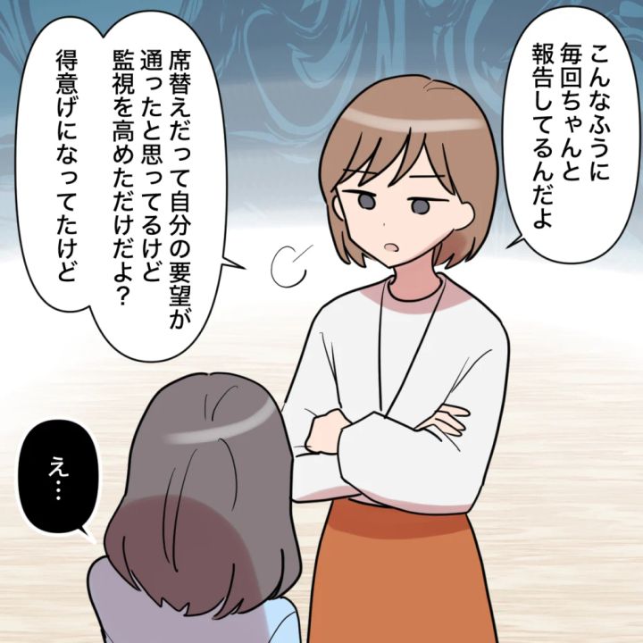 「こんなふうに毎回ちゃんと報告してるんだよ」と言った後、「席替えだって自分の要望が通ったと思ってるけど、監視を高めただけだよ?得意げになってたけど」私の言葉に「え・・」戸惑う田中さんは何も言えませんでした。