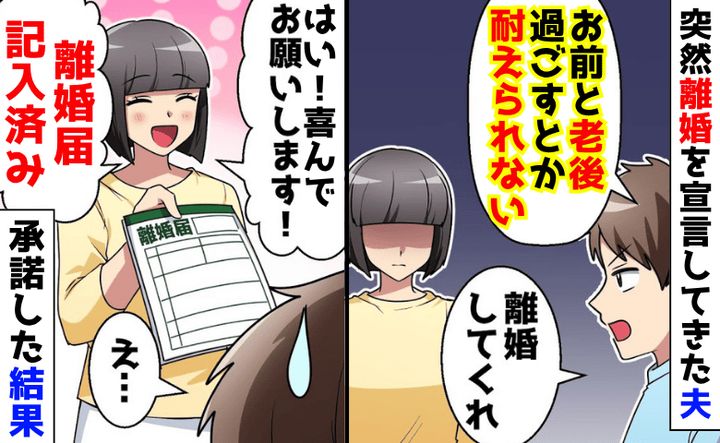 夫「お前との老後は耐えられない!離婚だ」突然の宣告。喜んで♡私から記入済みの離婚届をピラッ!大逆転の結末