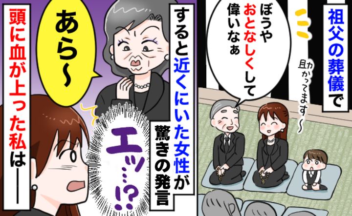 祖父の知人らしき方が息子を見て、「おとなしくしていて偉いな〜立派だね」と声をかけてくれました。私も「今日はとても助かっています」と答えたのですが……。近くにいた女性から非常に失礼な言葉をかけられました。