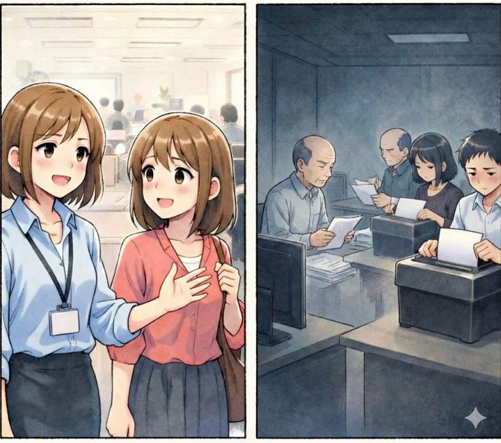入社初日、案内役の先輩は柔らかな微笑みを浮かべて、私をオフィスへと導いてくれました。日当たりの良いフロアにはデスクが並び、社員たちの活気ある声が心地よく響いています。