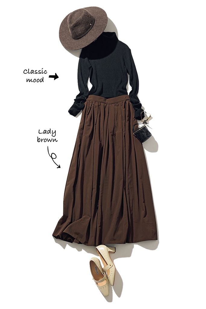 撥水加工、接触冷感、UVカット機能を完備した、年中活躍するブラウンスカート。キレイめに装うときは、黒のリブニットでレディな表情を強めて。スリム×フレアの上下バランスで抑揚がつき、ダークカラーどうしのレトロな色づかいもほっこり見えない。ミニバッグでかわいげもカバー 黒タートルネックニットは着回し。ブラウンスカート/N.O.R.C ハット/ヘレンカミンスキー