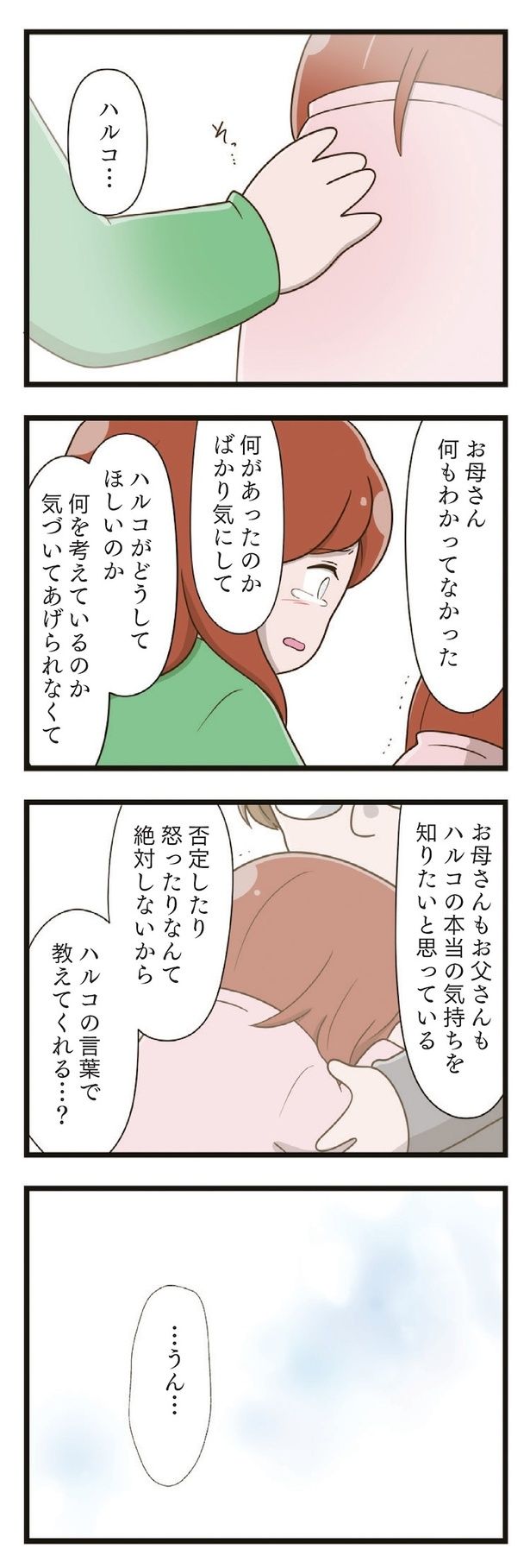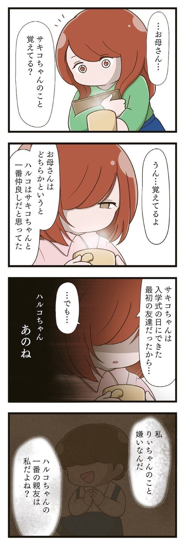 「お姉ちゃん学校でいじめられているんだって」息子の一言がきっかけで、母親は娘・ハルコの言動に違和感を抱くようになる。その結果分かったのは、ハルコが4年間、ひとりでいじめに耐えて隠し続けていたこと。いじめの本当の加害者は、被害者は誰? いじめと向き合う家族が希望を取り戻すまでの物語『家族全員でいじめと戦うということ。』を再連載でお届けします。いじめの原因になった同級生を描く新作『「お母さんの言うとおり」にしてきたのに 家族全員でいじめと戦うということ。 サキコの場合』も好評発売中です。