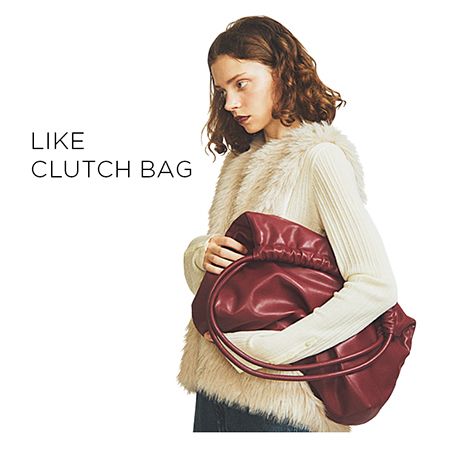 自在に変形できるエコレザーのトートを、折ってクラッチのように。ブラウンの延長的に使えるボルドーは、白っぽい装いの引き締めにも。A4が入るサイズ感、出し入れがしやすい巾着仕様など実用的な点もポイント。