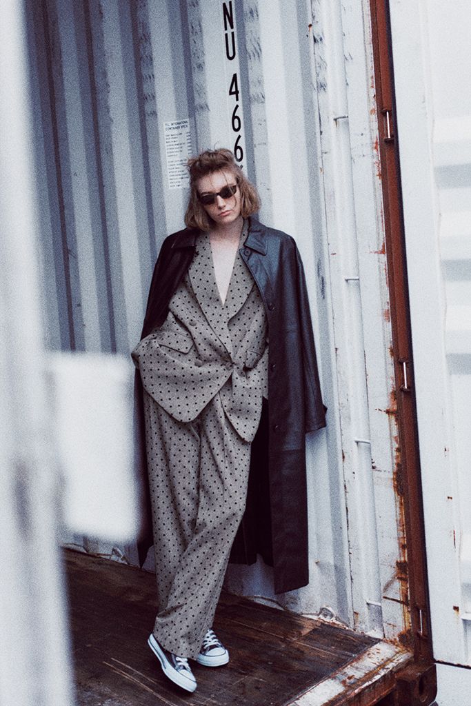 合わせる服を選ばない、グレーベースに細かなドットを配した着回しやすい柄のセットアップ。メンズライクなダブル&ほどよいゆったり感で、コートの中に着ても、アウターとしても活躍。同素材のくるみボタンがアクセント。