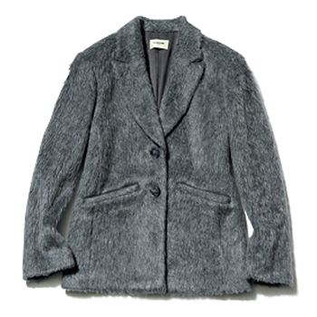 ふわっとやわらかい起毛感をそなえるジャケットコート。白も感じるグレーが、おかたくなりすぎない抜け感のあるハンサムスタイルを確立。肩パッド入りでさらにスマート。