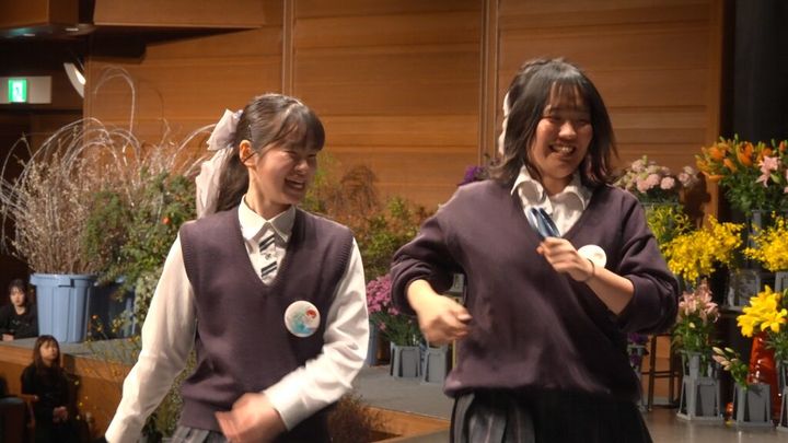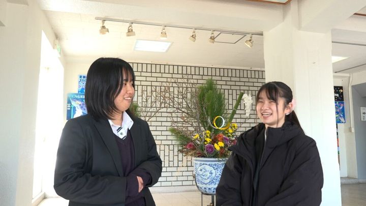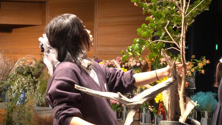 大会に向けて、華道部の仲間たちと豊中の花市場を訪れた2人。選んだ植物で校舎の玄関に飾る新年の花をいけます。今回は花いけバトルの制限時間である5分間でなく、時間をかけてじっくりと制作しました。