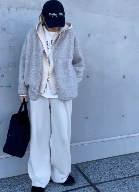 ボトムスにもユニクロの「ウォームフリースストレッチパンツ」値下げで1,990円を合わせることで、暖かさと動きやすさを両立。膨張しがちな明るい色のワントーンですが、インナーにロゴスウェットを仕込み、黒のキャップやネイビーのトートバッグで全体をきゅっと引き締めれば、メリハリのある都会的なバランスに仕上がります。足元まで抜かりなく白を繋げることで、リラックスした雰囲気の中にも品格が漂う、大人のための休日スタイルです。