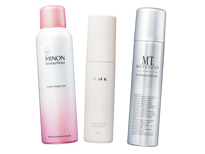 左から:吸着ヒアルロン酸配合。角質層まで浸透し保湿。ミノン アミノモイスト モイストチャージ ミスト150g ¥2,090〈編集部調べ〉()オイルとうるおいの2層式タイプ。乾燥による崩れや毛穴落ちを防ぎ透明感が復活。RMK コンディショニング グロウミスト50ml ¥3,300()霧のように超微細なミスト。美容成分たっぷりのうるおいが重なり、しっとり肌に。MTメタトロン MT リペア グロウ ミスト 60ml ¥5,940()