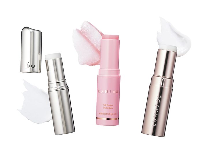 左から:つっぱる肌に水分補給。とろけるように浸透してみずみずしい肌に。ザ・タイム R デイエッセンススティック e 9.2g ¥3,410()サーモン由来成分とチェジュ島産発酵オイルを配合。ハリとうるおいが溢れるような使い心地。WRバウンス マルチバーム 9g ¥3,190()みずみずしいツヤ膜で肌の凹凸を滑らかに補整。ルナソル ラディアントスティック N 01 ¥4,950()