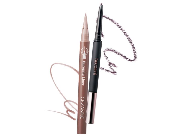 左から:ショート筆でブレずに繊細なラインを描ける。水・皮脂・擦れに強く、描いたラインをピタッとキープ。セザンヌ ブレぴたライナー20 ¥891()クリーミーな質感でまつ毛のキワもスルスル描ける。にじまずに描きたての色が長持ち。ラスティング ジェルアイライナーPU101 ¥3,850()