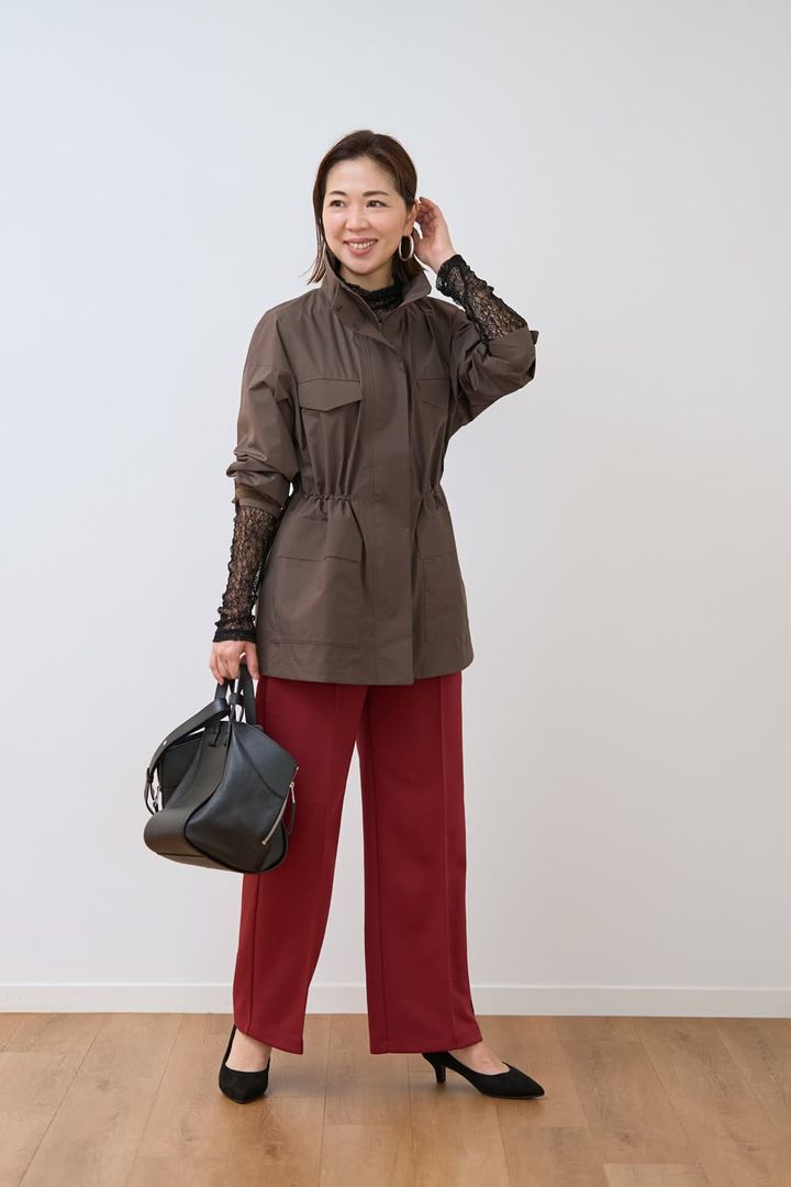 「UNIQLO:Cの手に取りやすい価格が、私の冒険心に火をつけてくれたレッドのスエットパンツ。落ち着いたトーンのレッドが大人だから挑戦しやすく、コーデ全体を引き締めてくれます。撥水機能、防風性を持った素材の軽やかなアウターがアクティブさをプラスし、レーストップスをインして品を調節。今季トレンドのカラー2色使いで大人漂うカジュアルスタイルに。」