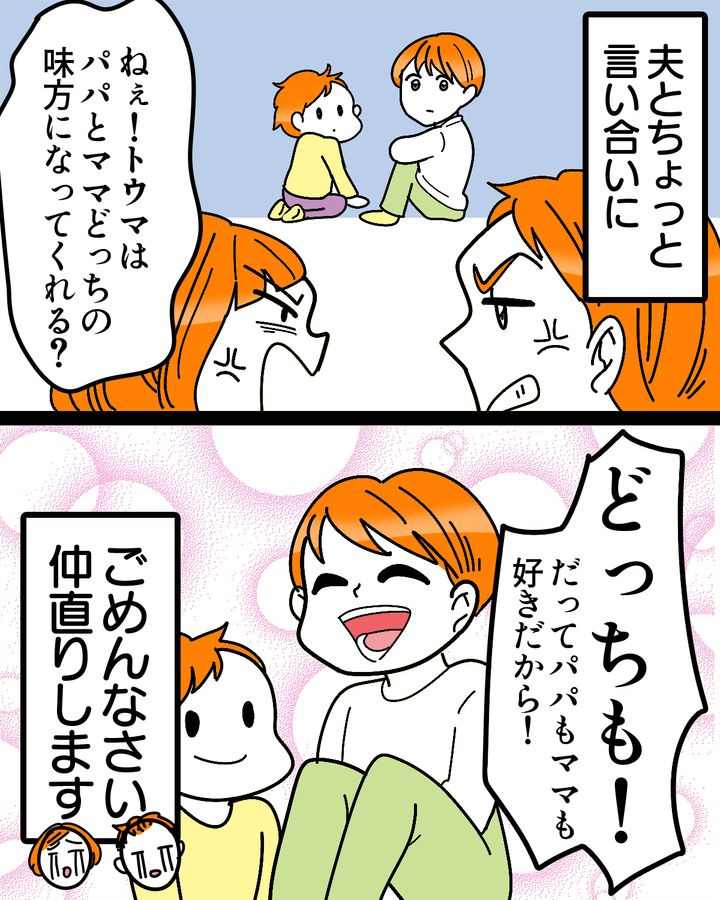 満面の笑みで放たれた衝撃のひとこと。これはスゴい! トウマくん、お見事です。さすがのパパとママもこの言葉を聞いて猛反省モードに。子どもの前で喧嘩してはいけなかったし、こんなこと聞いてはいけなかった。親なのに自分が情けないと思いながらも、わが子の発言はうれしかったのではないでしょうか。夫婦の縁をつなぐのはまさにわが子、これぞ「子はかすがい」ですね。
