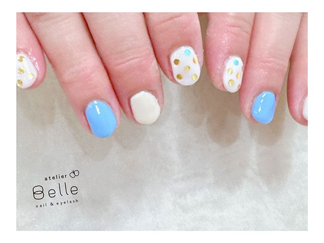 【大人可愛いキュートネイル】水色に合わせたゴールドドットがアクセント