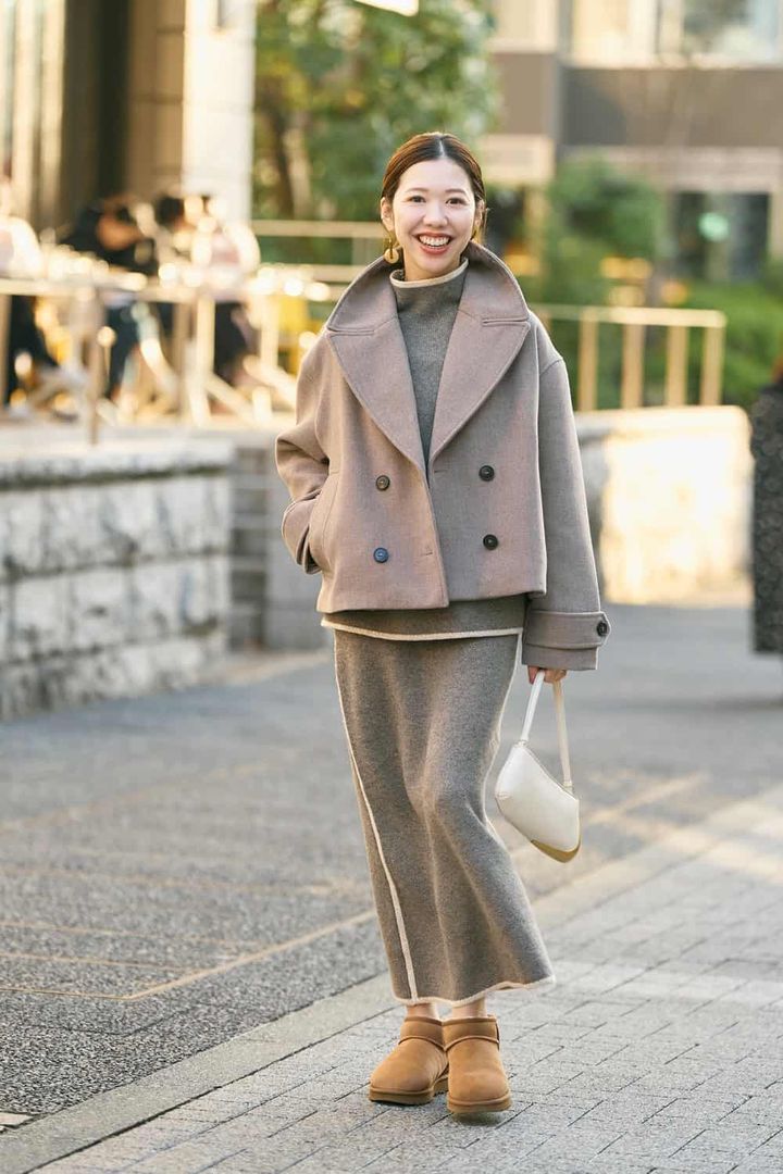 カジュアルになりすぎないようにムートンブーツ以外はキレイめなアイテムを選びました。まだまだ寒いけれど、少しずつ春ファッションへシフトしたい…そんな時は、足元で暖かさをキープしつつ、ピンクベージュのショートコートや白のバッグを取り入れることで春を先取りしたコーデが完成します。