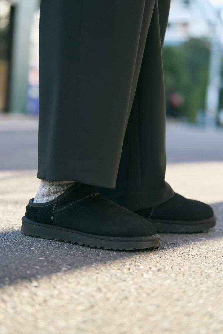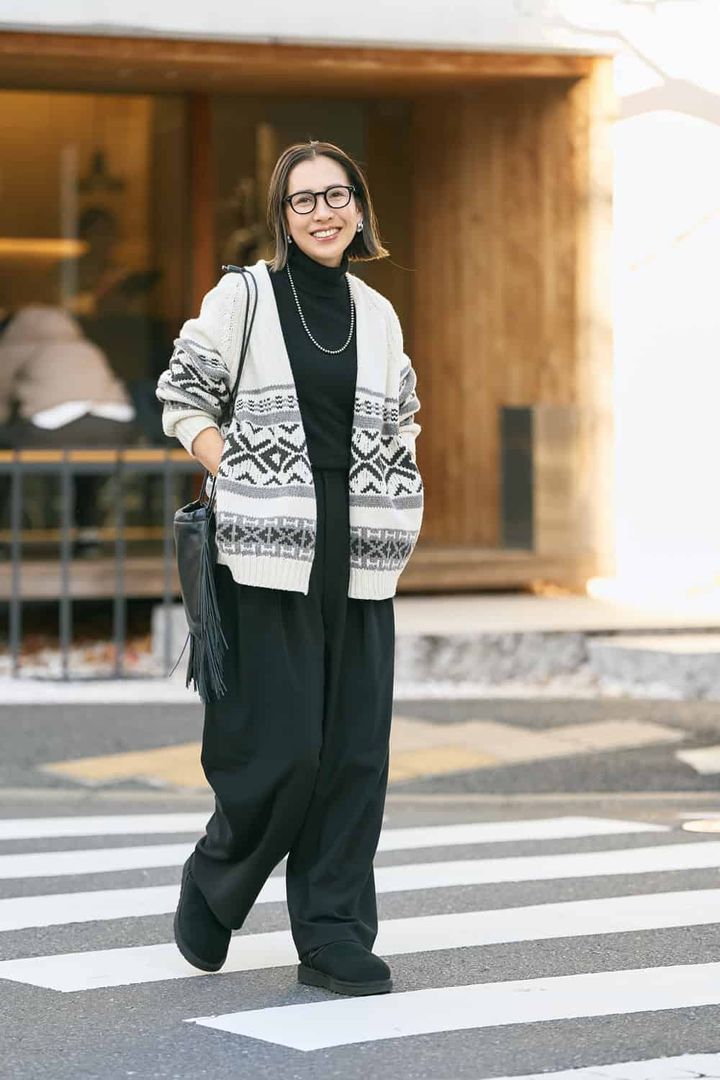 ぼてっとした印象になりがちなUGGはスリッパータイプのブラックをセレクト。トップスもパンツもブラックにすることでボリューム感を引き締め、モードな印象を作れます。オールブラックコーデには、着映え抜群な白のノルディック柄カーディガンを合わせてコントラストを効かせ、ラフだけど都会的な大人カジュアルコーデに仕上げました。