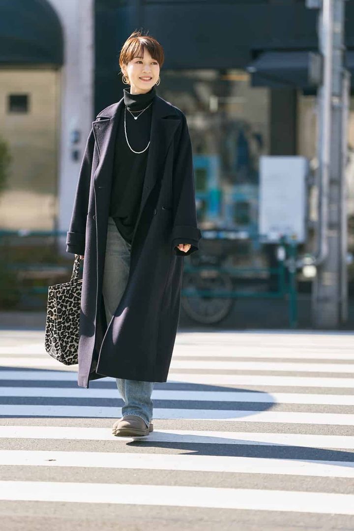 ロングコートと長め丈のデニムで縦長のラインを意識したスタイリングに。ネイビーのコートで品よくスタイリッシュな印象にまとめました。キレイめスタイルの“外し役”としてムートンブーツを投入。ベージックカラーを基調にレオパード柄のバッグを合わせて、さりげないエッジをプラスしました。