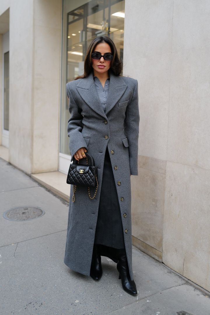 シャープなシルエットが光る、ダークグレーのマキシ丈コートがアレクサのお気に入り。同色のシャツや黒タイトスカートなど、合わせるアイテムはミニマルにまとめ、ポインテッドトゥのブーツでクールな着こなしに仕上げた。「シャネル」のバッグでパリらしいエレガンスをプラス。