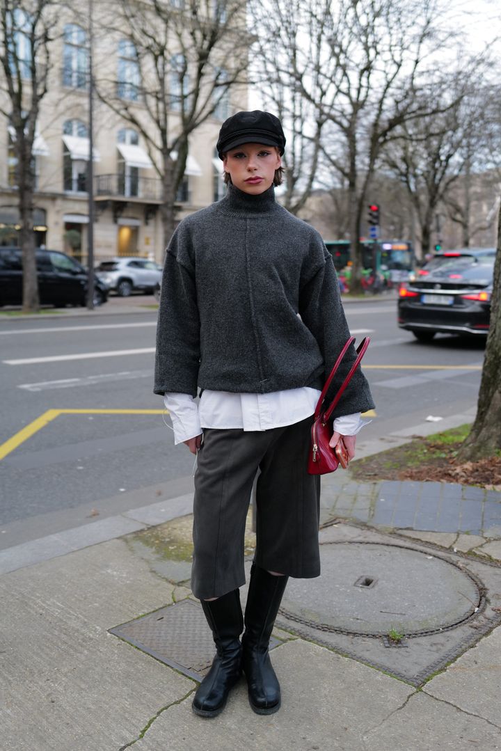 ハーフパンツにブーツ、キャスケットなど、トムボーイな雰囲気が魅力的なミカエルの着こなし。ダークトーンのカラーパレットに、鮮やかなレッドカラーのバッグや白シャツがくっきりと映える。