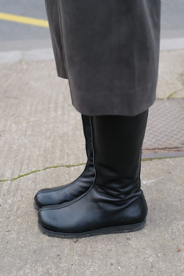 ブーツは「フランキーショップ」のフラットなタイプを愛用。足袋のようなたたずまいのミニマルなデザインがコーデをモダンに彩ってくれる。