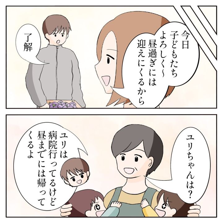 ある日の週末、いつものようにパートに出かける姉ちゃんが子ども達を実家に預けに来ました。「今日子どもたちよろしく~。昼過ぎには迎えに来るから」と言う姉ちゃんに「了解」と返事をしていると、母さんが「ユリちゃんは?」と聞いてきたので、病院に行っていることを伝えました。