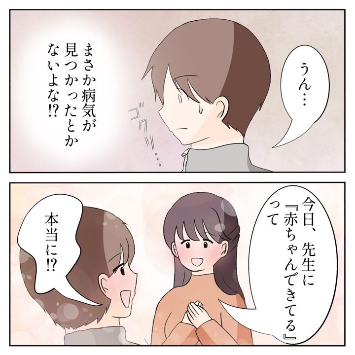 改まった言い方に、まさか病気が見つかったとかないよな!?と悪い想像をしてしまいます。しかし、ユリの口から出たのは、「今日、先生に『赤ちゃんできてる』って」と想像とは真逆の最高に嬉しい報告でした。「本当に!?」思わず大きな声が出てしまいました。