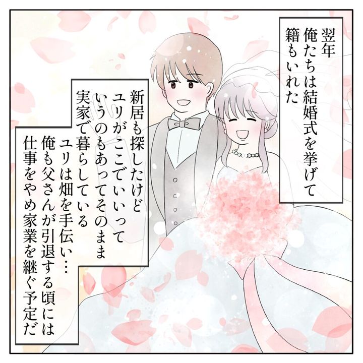 翌年、俺たちは予定どおり結婚式を挙げて籍もいれました。一度は新居も探したけれど、ユリがここでいいと言うのでそのまま実家で両親と一緒に暮らしています。ユリは今までと同じように両親の農業を手伝ってくれており、俺も父さんが引退する頃には仕事を辞めて家業を継ぐ予定です。