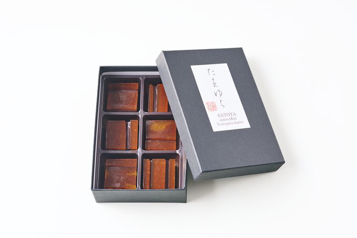完熟梅の銘菓『乃し梅』をはじめとする伝統菓子を作る山形県・佐藤屋八代目が考案し、話題の代表作に。和菓子の技法を用い、白あんと寒天でチョコレートと生クリームをつないで和の生チョコを作り、そこに伝統の乃し梅をのせた、新感覚の和菓子チョコレートです