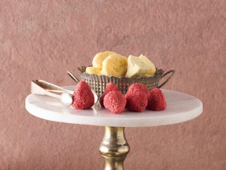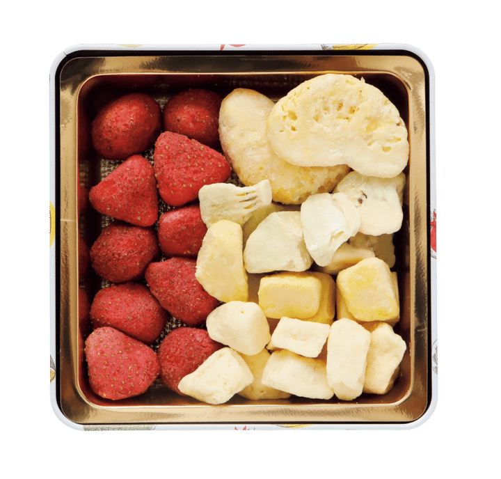 フリーズドライフルーツにホワイトチョコをたっぷりしみ込ませていて、これまでになかった最新スイーツだと思います。フルーツ×ミルキーな味の組み合わせが好きな人にはたまらないはず。チョコだけだと食べているうちに重くなってきますが、フルーツと合わせているので〈さわやかに〉食べられるのが好きです