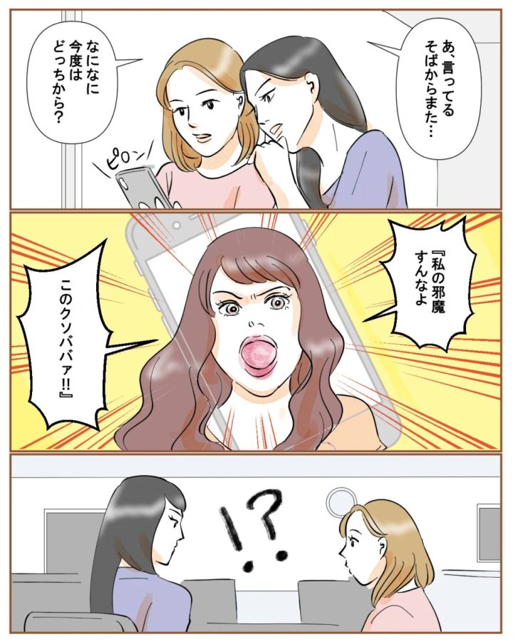 麗子と話していると、スマホにメッセージが届きました。きっとまた和也かほなみさんからのメッセージでしょう。「なになに、今度はどっちから?」と麗子に聞かれメッセージを開くと、「私の邪魔すんなよ。このクソババア!!」とかなりご立腹な様子のほなみさんからのメッセージ。邪魔?どういうこと?思わず麗子と顔を見合わせました。こんな風に言われる理由が思い当たりません。