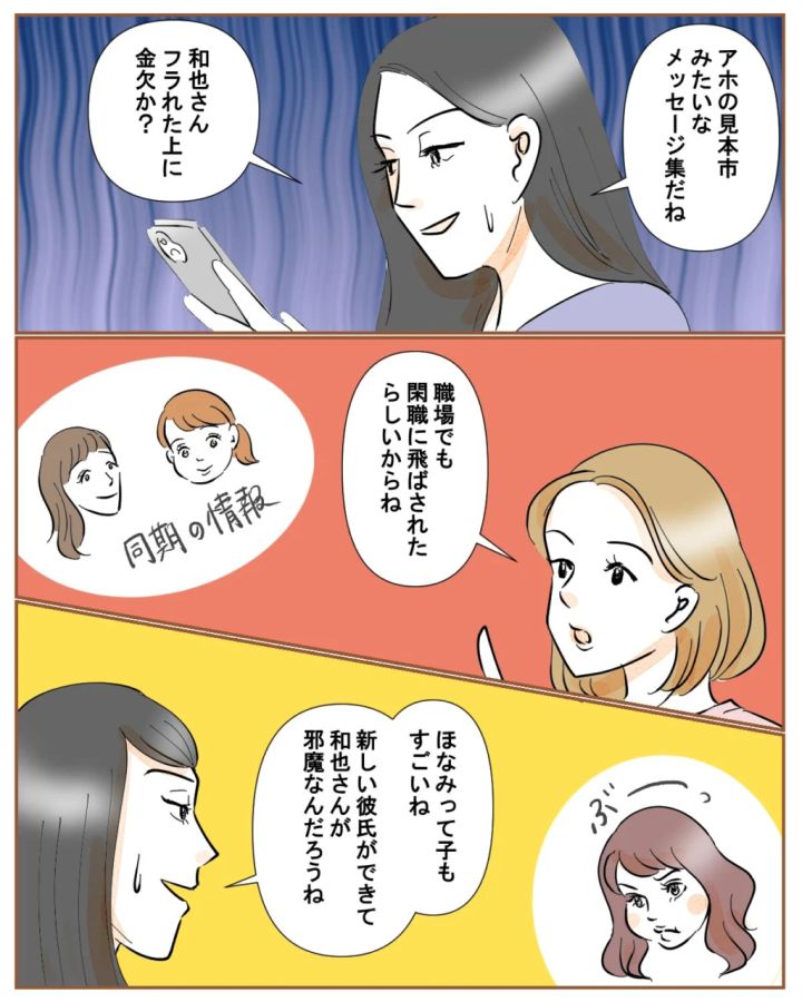 和也とほなみさんから届いたメッセージを麗子に見せると、「アホの見本市みたいなメッセージ集だね。和也さん、フラれた上に金欠か?」と苦笑いしていました。「職場でも閑職に飛ばされたらしいからね」と和也の会社と仕事でつながりのある同期から聞いたことを話すと、「ほなみって子もすごいね。新しい彼氏ができて和也さんが邪魔なんだろうね」と私と全く同じことを思っていた麗子。やっぱり、誰から見てもそう見えるよね。