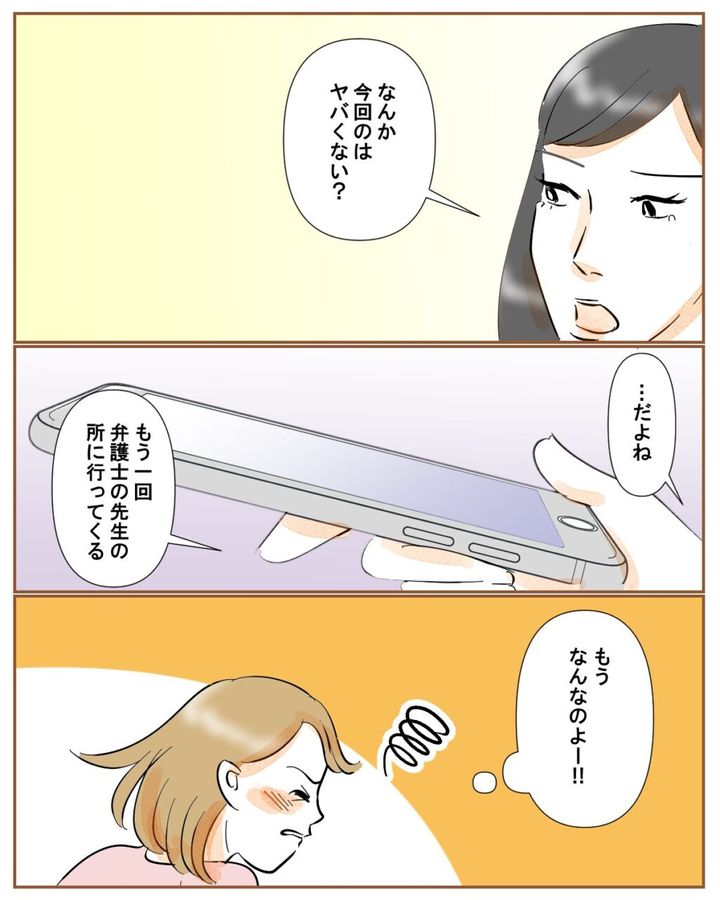 ほなみさんのメッセージからはかなりの怒りが伝わってきます。「なんか今回のはヤバくない?」と麗子にも心配され、離婚するときにお世話になった弁護士の先生に相談することにしました。もうなんなのよー!!和也とほなみさんが不倫して離婚になったのに、どうして私がこんなに悩まされる羽目になるのでしょう。ほなみさんから怒りを向けられる理由がわかりません。