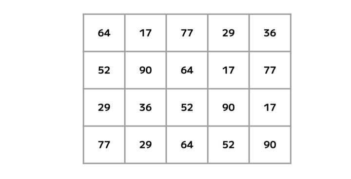 3. 【脳トレ】5×4の表に書かれた7種の数字「17・29・36・52・64・77・90」。1種だけ2つしかない!?その数字はどれだ??
