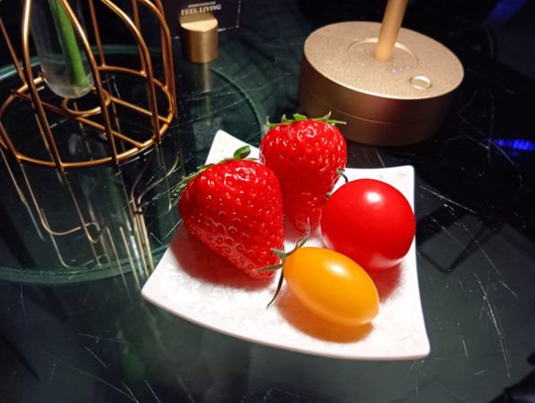 農薬を使わずに栽培されているイチゴとトマト。美しい…ぎゅっと詰まっていて、甘いこと甘いこと!栽培者は日高輝富さん。胡蝶蘭でジャパンフラワー農林大臣賞等、数々の賞を受賞した実績があるにもかかわらず、すっぱりやめてトマトやイチゴの栽培を開始
