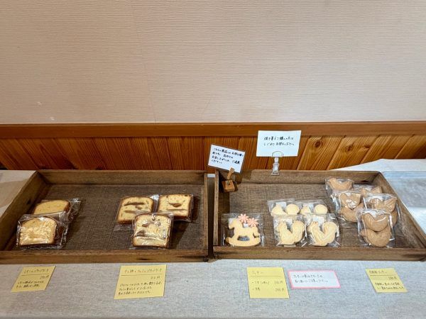 入り口ドアの近くに焼き菓子の販売が。可愛いクッキーやパウンドケーキが並んでいました。