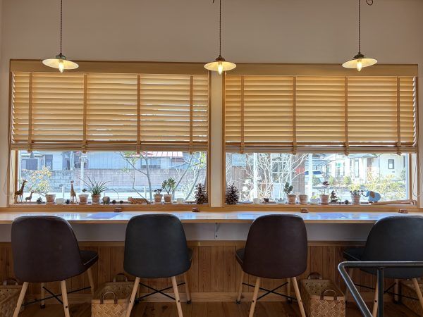 また窓に向かってのカウンターも落ち着いた感じ。ひとりでもゆっくり楽しめそう。窓辺の小物や照明も可愛らしくて素敵。