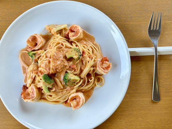 トマトのクリームパスタ。なんて色のきれいなパスタ!エビ、ぷりぷり。
