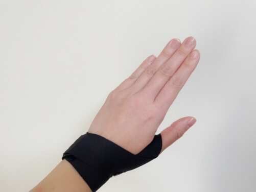伸縮素材の腱鞘サポートテープで、親指に貼りやすい形状。スポーツ時や日常生活で痛む親指に、簡単にサッと貼れて、しっかり固定できます。