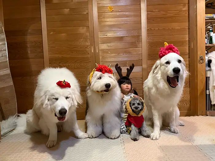 3歳の娘さんと愛犬たちは、本当のきょうだいのように仲よしです。この日は、みんなで節分らしい格好をして、記念写真を撮影したといいます。