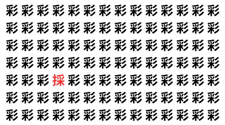 たくさんの「彩」の中に、よく似た別の漢字が1文字だけ隠れています。
