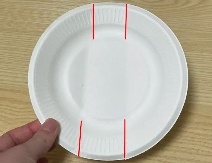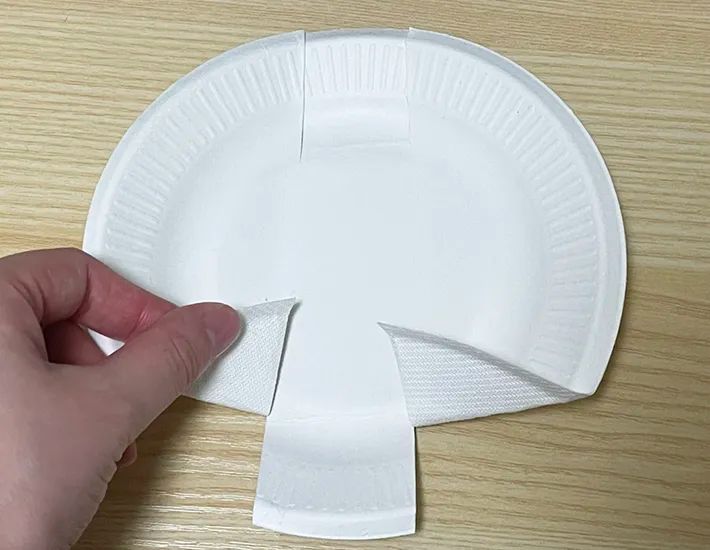 切り込みの長さに合わせて、紙皿の上下の端を折りましょう。しっかりと折り目をつけてから、再度開きます。