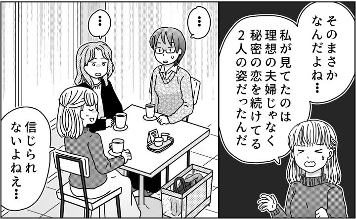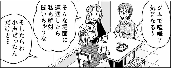 私はチナツ。久しぶりにママ友のヤエちゃん・イロハちゃんとカフェでお茶をしました。下の子が小学校に入ったことで自分の時間ができたので、最近スポーツジムに通いはじめたと話すと、2人は驚いていました。そして私の話は、ジムでいつも仲良さそうな「サトウ夫妻」の話に。私はその2人を理想の夫婦だと微笑ましく思っていました。しかしある日のこと、その夫婦になんだかただならぬ雰囲気が……。2人が固唾を呑んで私の話の続きを待つなか、ジムで目撃した気になる出来事を話しはじめました。