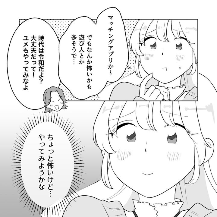 マッチングアプリかぁ・・・と、少し躊躇した私。遊び人とか多いイメージだし、なんか怖いかも。でもアキの「時代は令和だよ?大丈夫だって!ユメもやってみなよ」という言葉に背中を押されて、まだ少し怖い気持ちもあったけれど、やってみようかなと思いました。