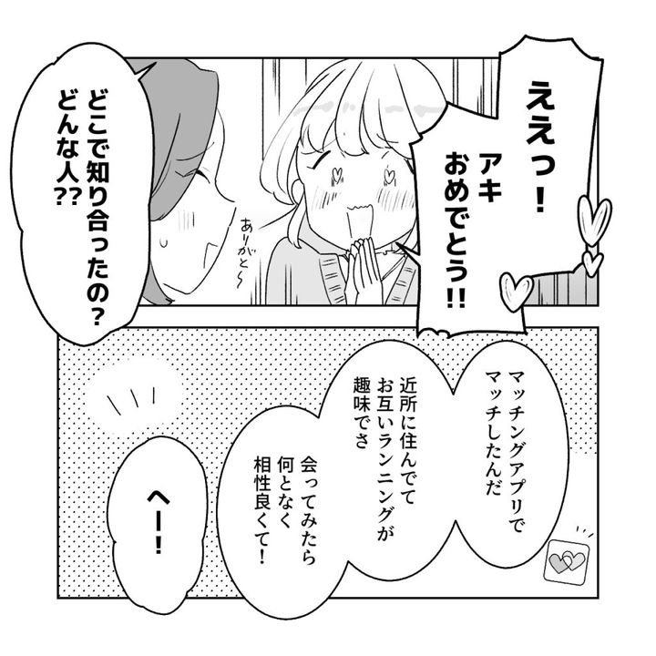 えぇっ!私はアキの出会いに大興奮です。「おめでとう!どこで知り合ったの?どんな人?」と思わず前のめりになってしまいました。アキの彼氏はマッチングアプリでマッチした人なのだそうです。近所に住んでいて、趣味のランニングも一致。会ってみたらなんとなく相性が良いと感じたと教えてくれました。興味津々で聞いていた私は、今までマッチングアプリなんて思いつきもしませんでした。