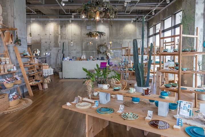 自然光が差し込む広々とした店内の「Laboratorio 43 pottery」は、体験工房だけでなく、作り手の顔が見えるような陶器やガラス、島の風土を感じられる食品、お肌に優しいコスメグッズなど、沖縄ならではの良いモノを厳選したセレクトショップも併設されています。