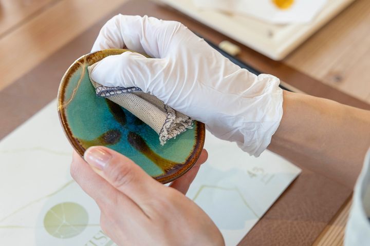 余分な金粉を払い落とし、エタノールを染み込ませた布で表面をなでるように拭き取ると、金のラインがくっきりと現れ、欠けていた部分が美しいアクセントへと変わります。