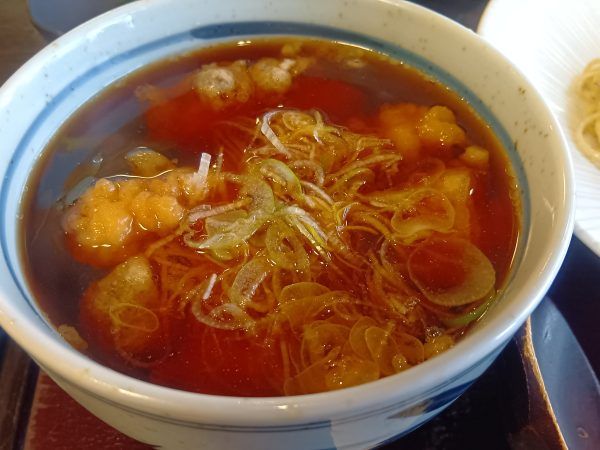 そして、温かいつけ汁には揚げもちと小海老天の2種類入り。香ばしくもっちりとろりとした揚げもち。小海老天もぷりぷり。これだけでも美味しいけれど、冷たい蕎麦を温かい汁にin。揚げもちなどのコクある油が蕎麦を纏って、より一層箸が進みます♪