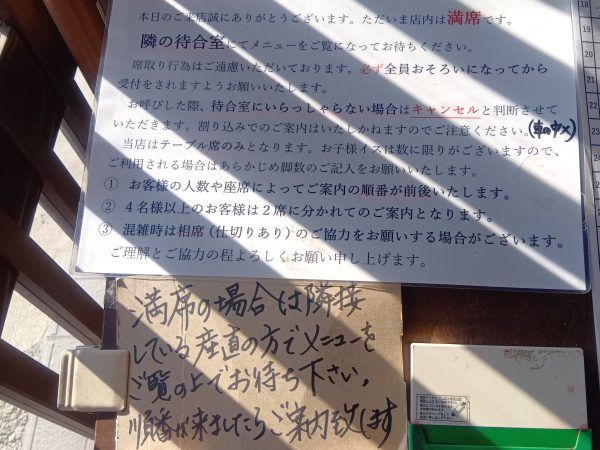 予想通り満席だったので受付ボードに名前を記入。「隣の待合室でメニューをご覧になってお待ちください」とのこと。呼ばれるまで待合室で楽しく待ちましょう。